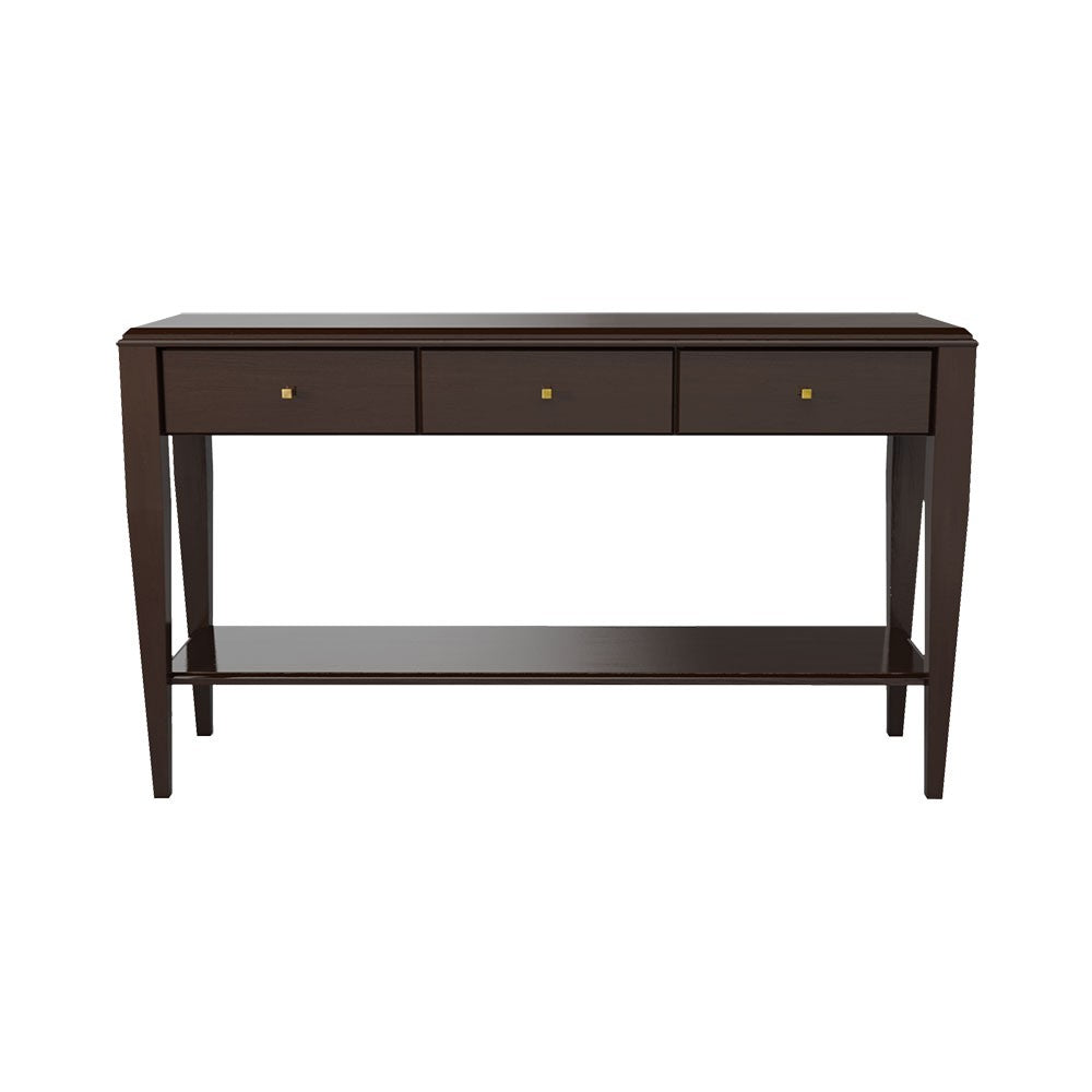 Emma console - beauty lies in simplicity, that's what Emma is. A piece of furniture with a beautiful straight line. Slender legs, slightly tapering downwards, give it lightness. The purity of the form directs the eye to refined details. Emma will perfectly fit into the assortment of classic and modern furniture, giving great arrangement possibilities. Noteworthy is the original, matte color in a shade of cool brown, emphasizing the natural grain of the wood. Two convenient drawers and an additional shelf provide a lot of storage space. The piece of furniture will work as a wall decoration or an assistant in the living room or bedroom, it will also be found in an elegant office and study.